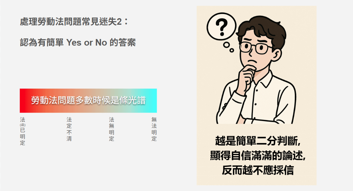 - 能將複雜的用人情境拆解為關鍵法律議題,釐清問題核心。