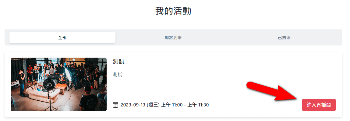 請於9/28晚上19:20,到「我的活動」頁面,按「進入直播間」即可(示意圖如下)。